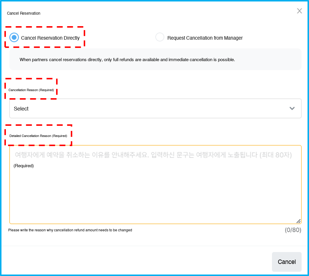 Therefore, when you cancel using the 'Direct Cancellation' feature, the information you enter will be directly delivered to the traveler,