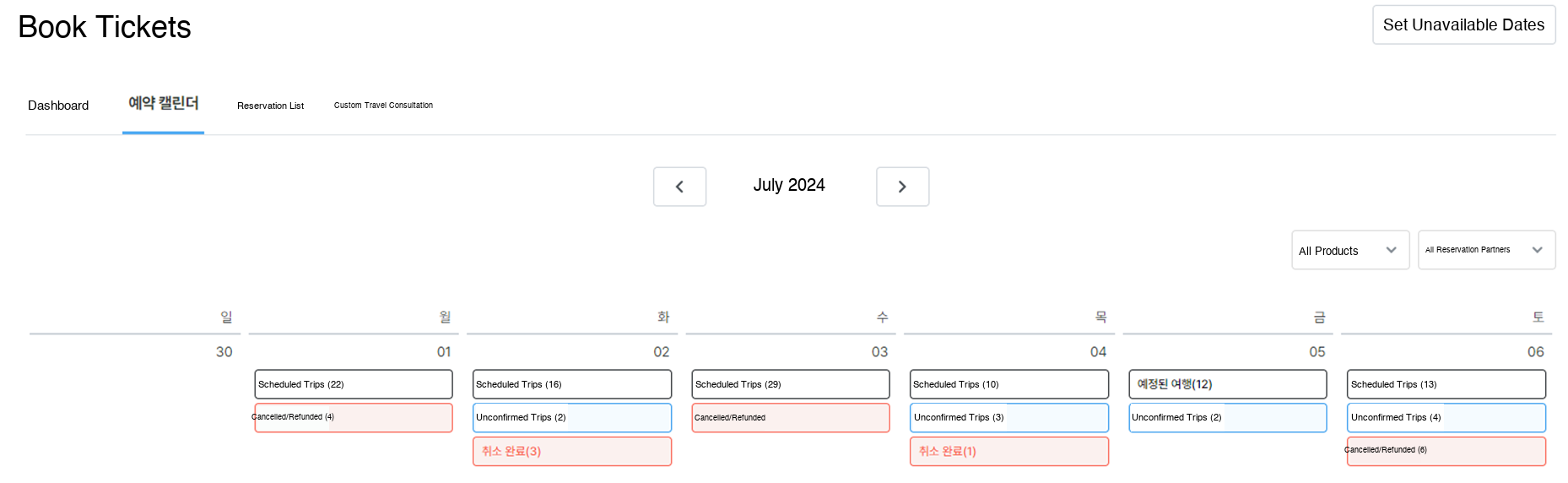 | Unconfirmed Trips | You can check all unconfirmed reservations (based on all products/dates). |