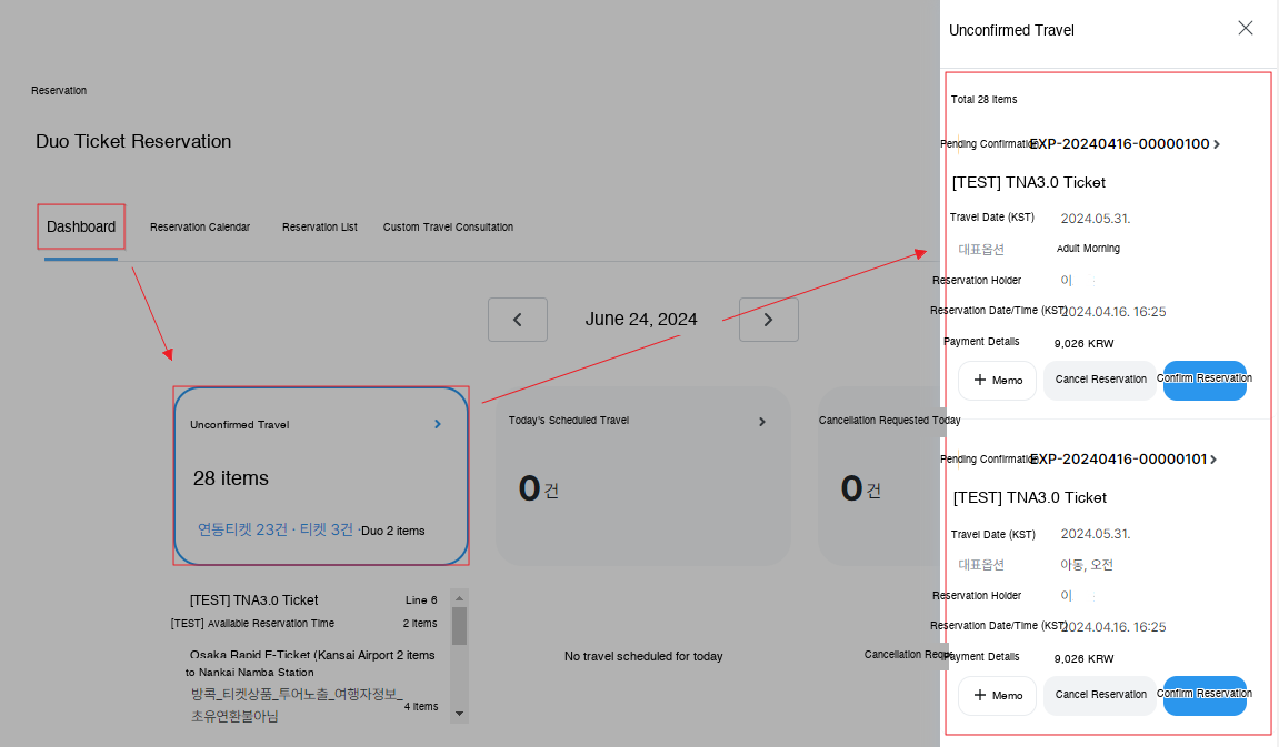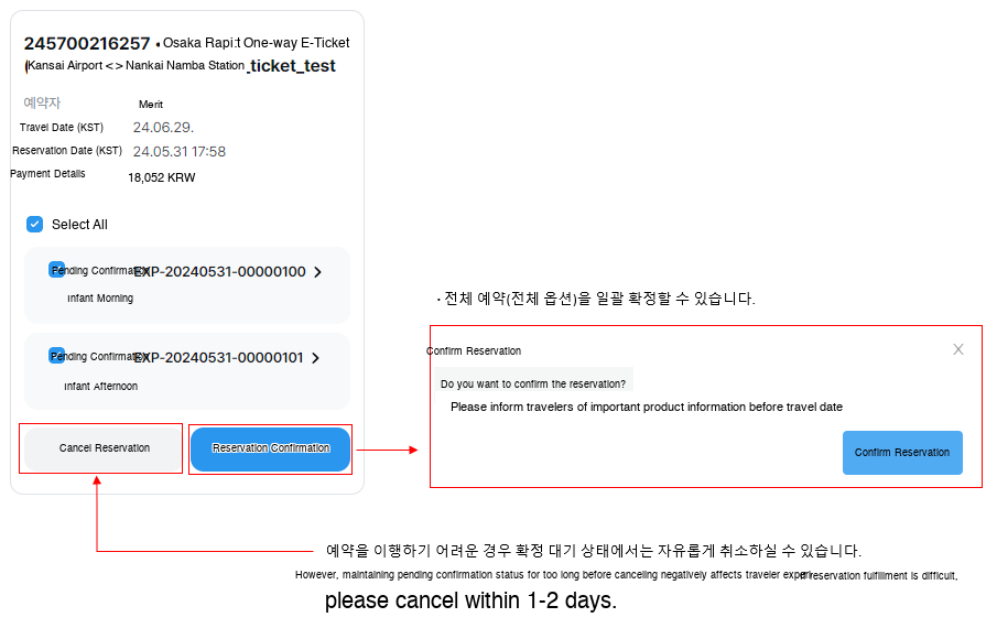 - While the previous method would only show TNA-20240624-0000001 and require checking actual purchase quantity in reservation details, the new method displays 3 reservation numbers: Adult 1: EXP-20240624-0000001, Adult 2: EXP-20240624-0000002, Child: EXP-20240624-0000003.