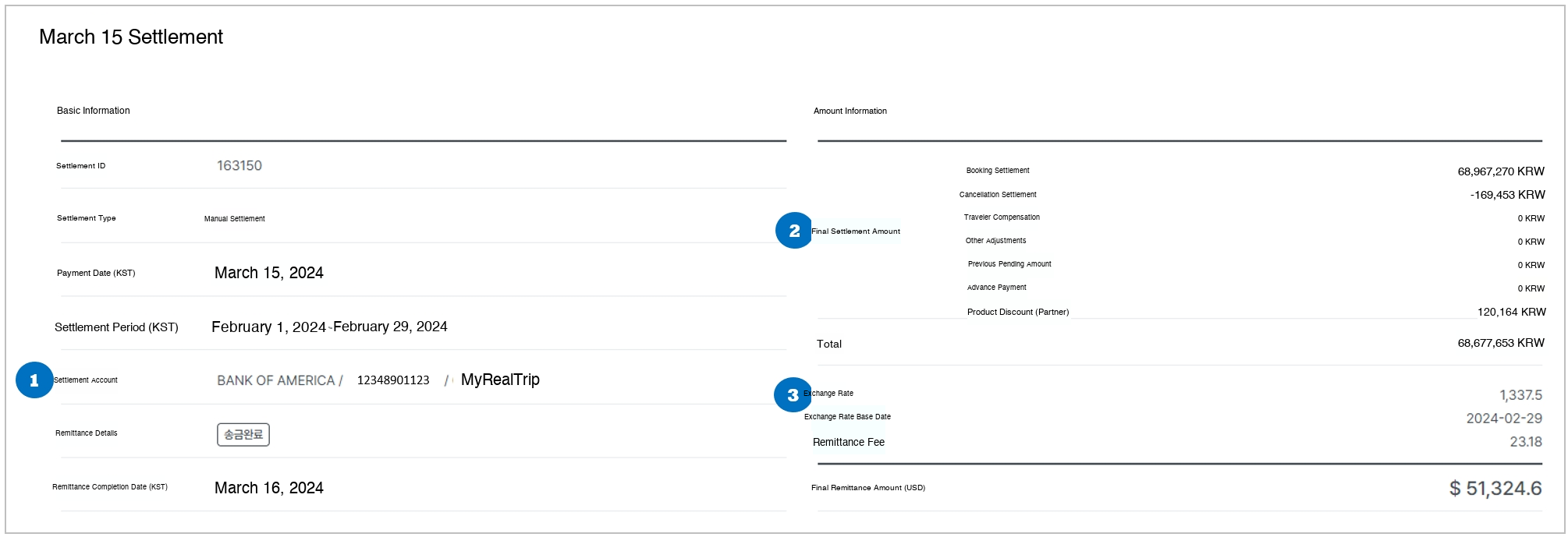 Booking Settlement - Traveler Compensation - (+)Other Adjustments - Product Discount - Advance Payment + Cancellation Settlement + Previous Withheld Amount - Wire Transfer Fee