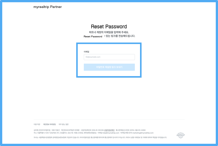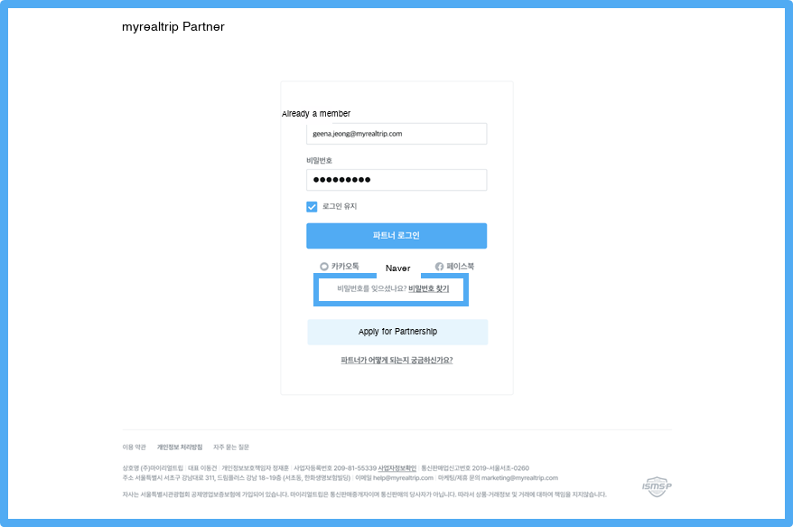 You can reset your password by clicking the 'Find Password' button on the partner login page.