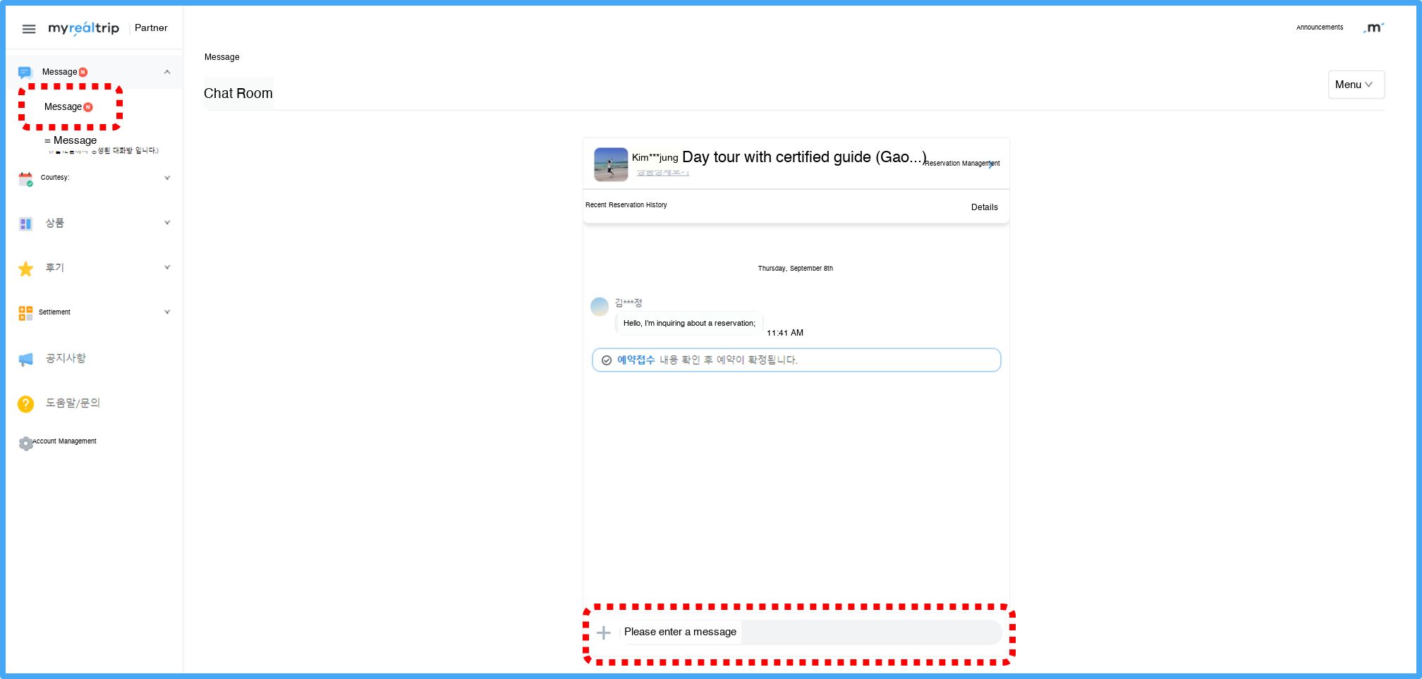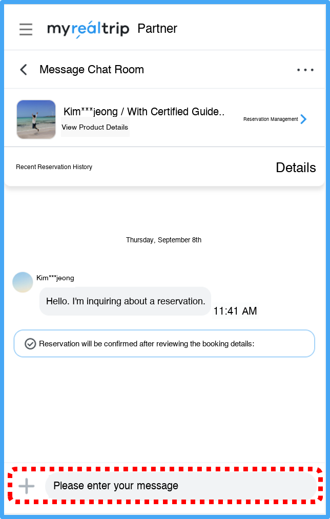 * You can check conversation history with travelers by clicking the [Chat Room] button in the upper right of the reservation details page, or in 'Conversation with OOO'.