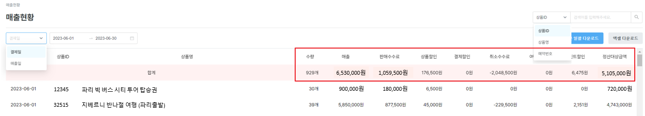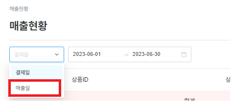 Step 1. 파트너 페이지 → 파트너 정산 → 매출 현황 → 필터 설정을 매출일로 변경