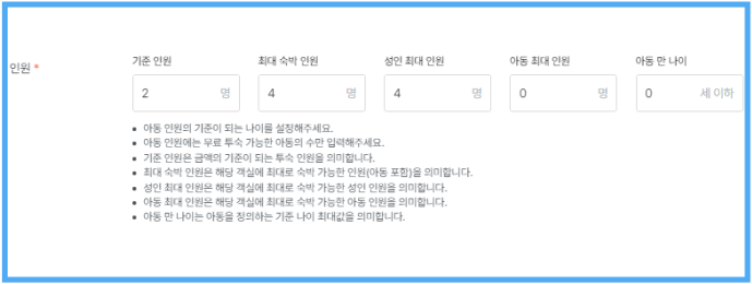 - 최대 숙박 인원은 해당 객실에 아동을 포함해서 최대로 숙박 가능한 인원을 기재해주세요. 기준 인원과 같거나 큰 숫자만 입력 가능합니다.