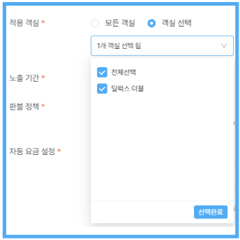 - 옵션이 특정 객실에 적용되는 경우, [객실 선택]을 클릭하여 해당하는 객실들을 모두 선택해주세요.