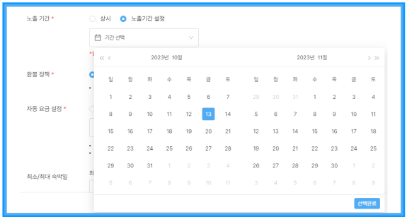 - 특정 기간동안 옵션이 노출되길 원하시는 경우, [노출기간 설정]을 클릭하여 시작 일자와 종료 일자를 선택해주세요.