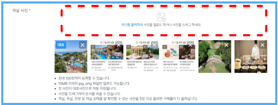 - 숙소 전경, 부대 시설, 객실 등 상품을 잘 확인할 수 있는 사진을 5장 이상 올리시면 구매율이 더 올라갑니다.