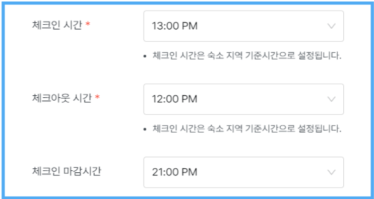 숙소가 위치한 지역 기준으로 체크인/체크아웃 가능한 시간을 입력해주세요.