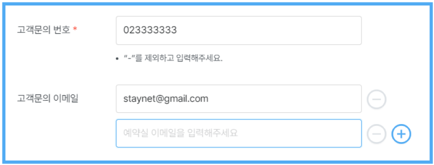 고객문의 이메일은 예약실 이메일로 입력해주세요. [+]를 선택하여 추가로 이메일을 입력하실 수 있습니다.