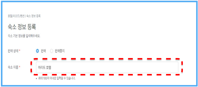 - 판매 여부를 선택해주세요. [판매중지]로 설정 시, 자동으로 모든 객실이 판매 중지로 변경됩니다.