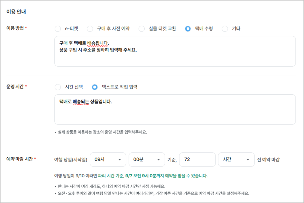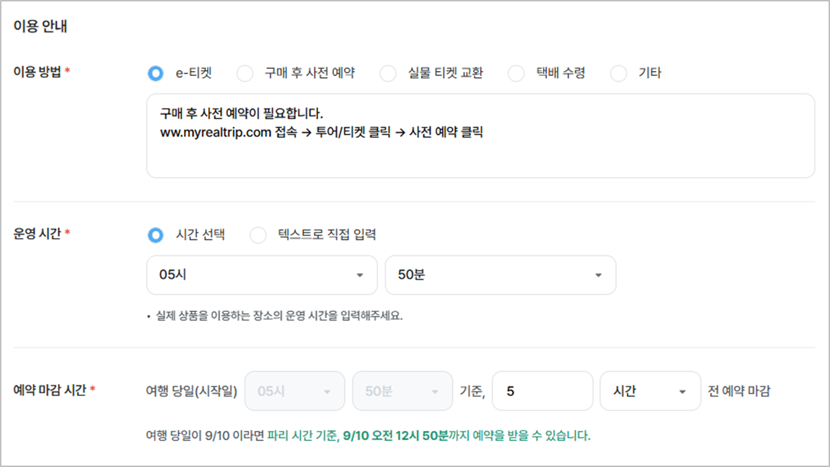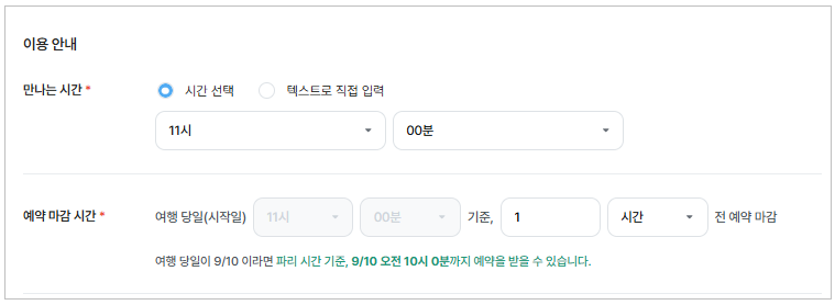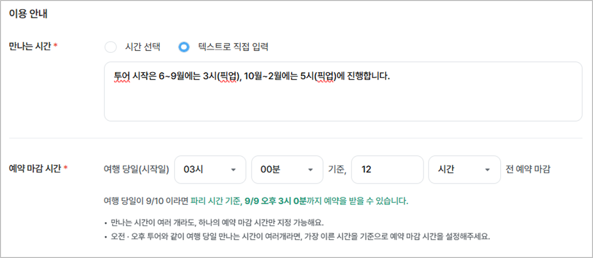 - 대표 도시를 "파리"로 설정한 루브르 박물관 투어 상품을 아래와 같이 설정한 경우, 파리 시간 기준으로 예약이 가능합니다.