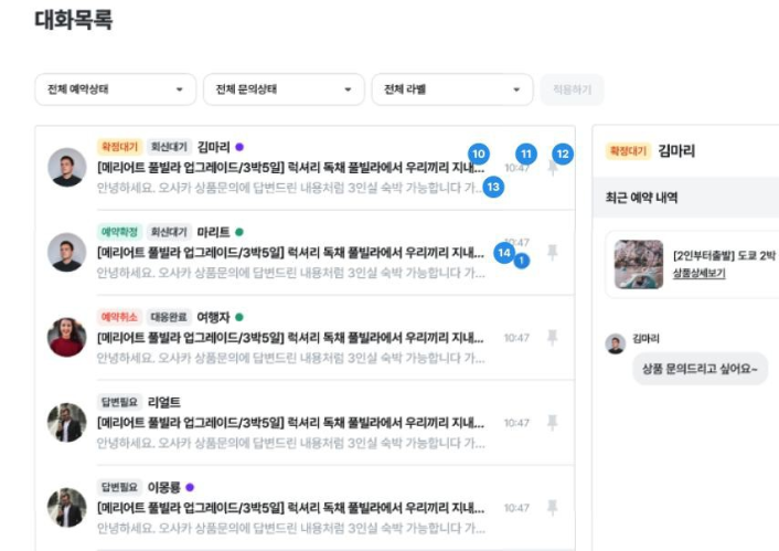 · 대화방 내에 있는 예약건 중 단 하나라도 해당 상태값을 가지고 있으면 필터가 적용됨