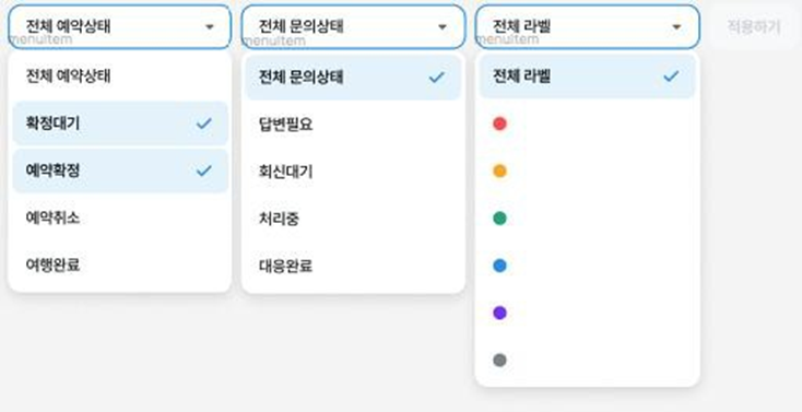 👉 결과 값 : 확정대기, 예약확정, 답변 필요, 회신 대기, 라벨 전체인 모든값 보임