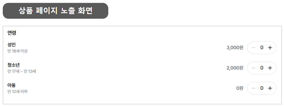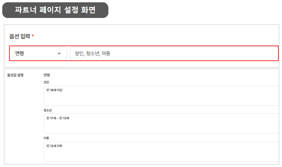 2. 옵션 사용 : 연령만 설정 2024년 10월 21일 01:10 업데이트 시간 옵션 설정 조건 💡 Tip 단일 옵션이지만 연령에 따라 옵션 가격이 다른 상품에 적합한 설정입니다. 1. 옵션 설정 조건 옵션 사용 여부 : 사용 연령 설정 : 사용 (성인, 청소년, 아동 기준으로 설정) 옵션명 : 사용하지 않음 옵션값 설명에 옵션에 대한 상세 정보를 입력하면 판매에 도움이 됩니다. 성인, 청소년, 아동 다중(복수) 선택하여 구매할 수 있습니다. (예시) 성인 2명, 아동 3명을 한번에 구매할 수 있도록 설정됩니다. 파트너 페이지 설정 화면 관련 문서 [옵션 등록] 2. 캘린더 사용/미사용 시 여행 완료 기준 [투어티켓] 카테고리 별 옵션 노출 예시 상품 참고 [도움말] 상품 등록 필수 서류 안내 5. 옵션 사용 : 연령 미설정 + 옵션 1개(필수)만 설정 +최소 구매 수량 설정 4. 옵션 사용 : 연령 미설정 + 옵션 1개(필수)만 설정
