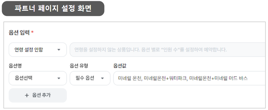 - 옵션명 이름은 자유롭게 설정할 수 있습니다. 여행자 화면에 동일하게 노출됩니다.