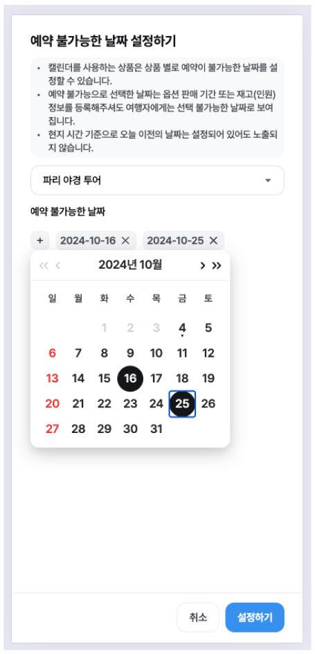 - 투어·티켓 상품(신규) 페이지 상단에 [예약 불가 날짜 설정하기] 버튼을 통해 설정할 수 있습니다.