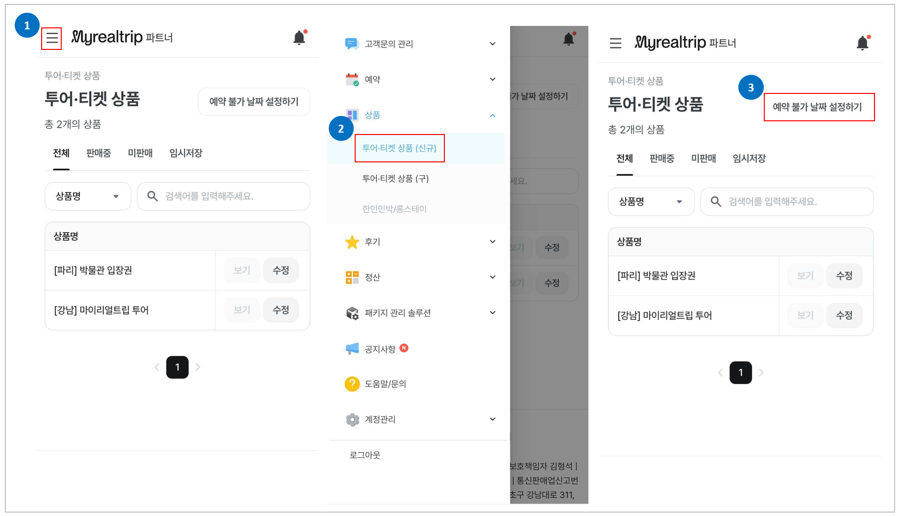1. 왼쪽 상단 三 클릭 → 투어·티켓 상품(신규) → 화면 상단 [예약 불가 날짜 설정하기] 클릭