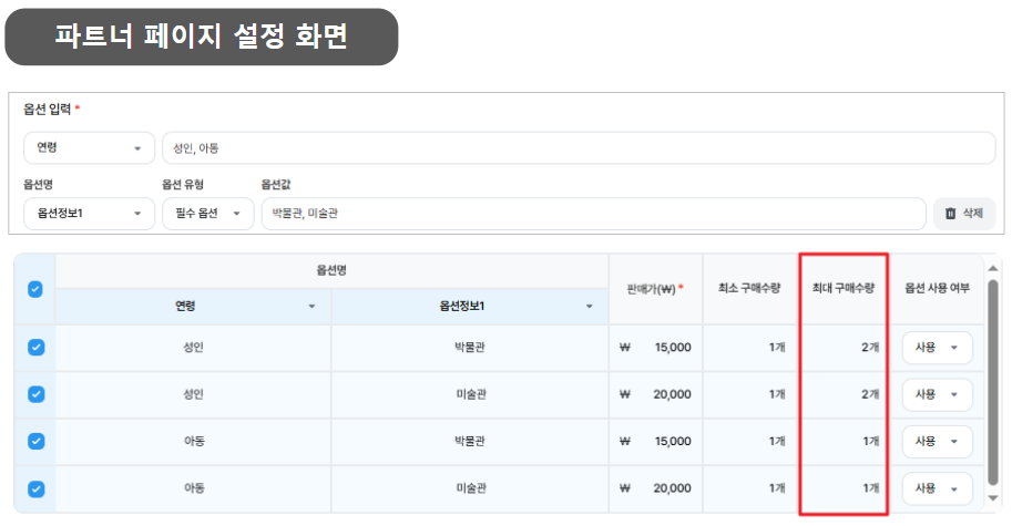 - 최소 구매 수량 : 성인 2개, 아동 1개로 설정