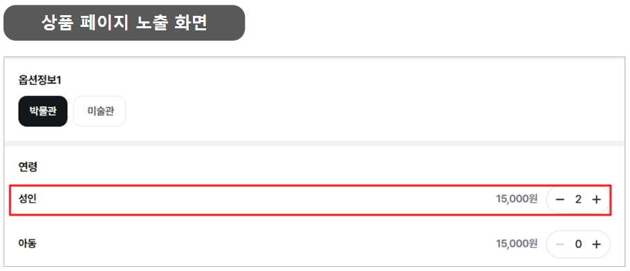 - 각 옵션별로 성인, 아동 수량을 설정하여 구매할 수 있도록 노출됩니다.