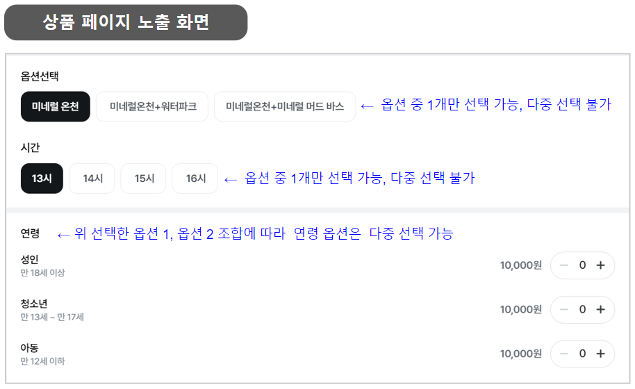 - 옵션1 + 옵션2 + 연령 정보를 조합하여 구매할 수 있도록 노출됩니다.