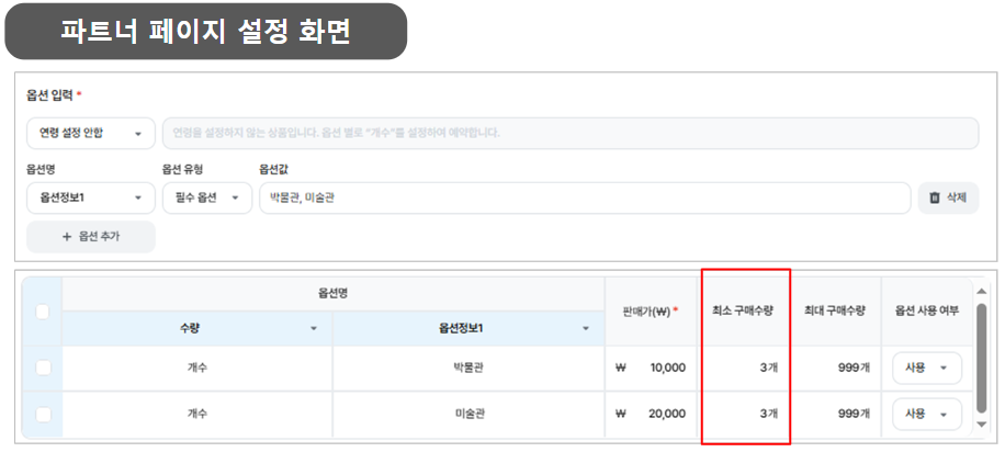 - 최소 구매 수량 : 3개로 설정