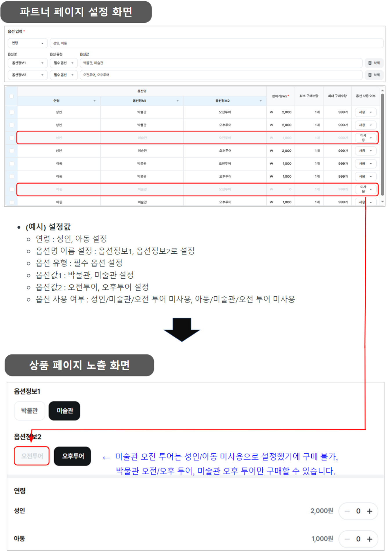 - 옵션1 박물관 + 미술관, 옵션2 오전, 오후를 다중(복수) 선택하여 구매할 수는 없습니다.