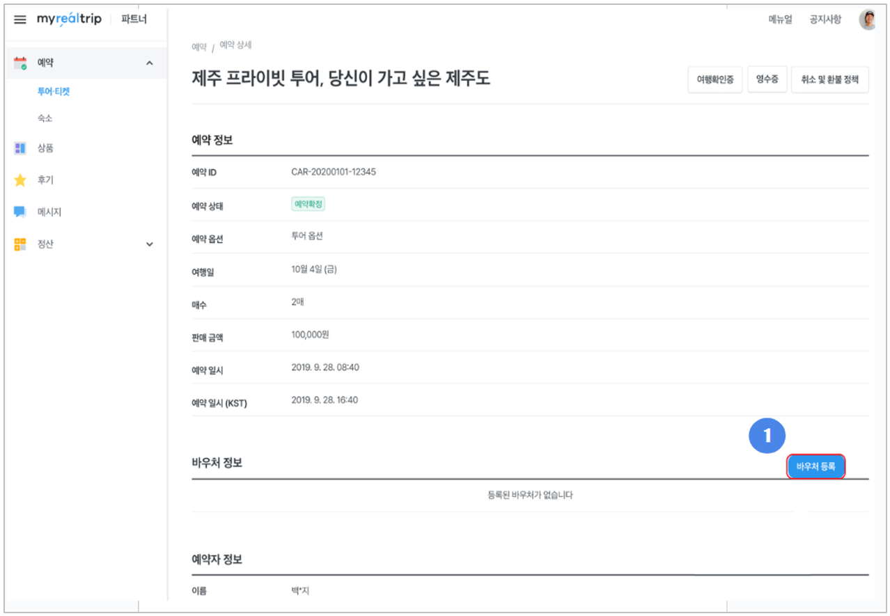 Step 1. 예약 → 투어·티켓 → 예약 상세 접근 → 바우처 등록 클릭