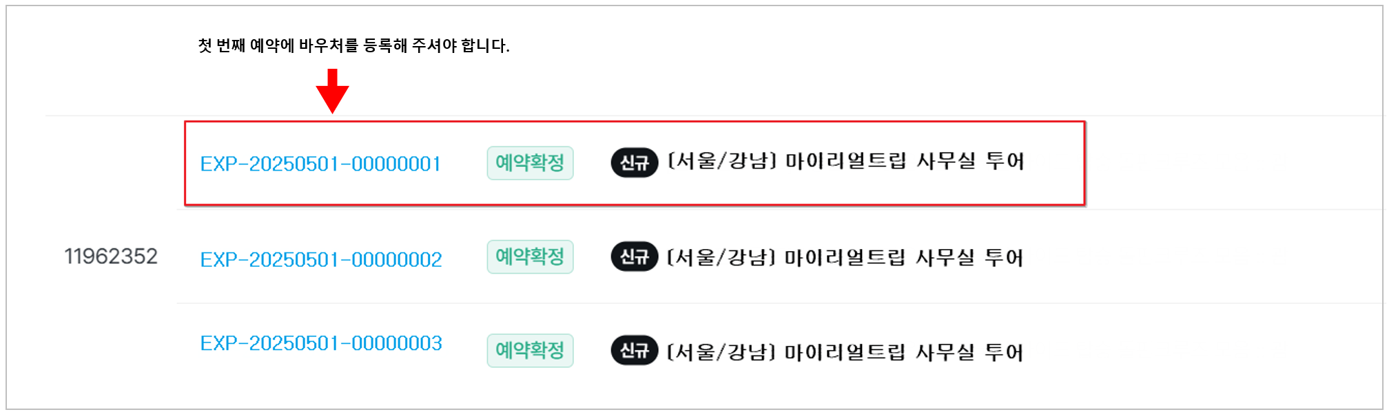 - 바우처 업로드는 첫 번째 예약인 EXP-20250501-00000001에 등록해 주셔야 여행자가 확인할 수 있습니다.