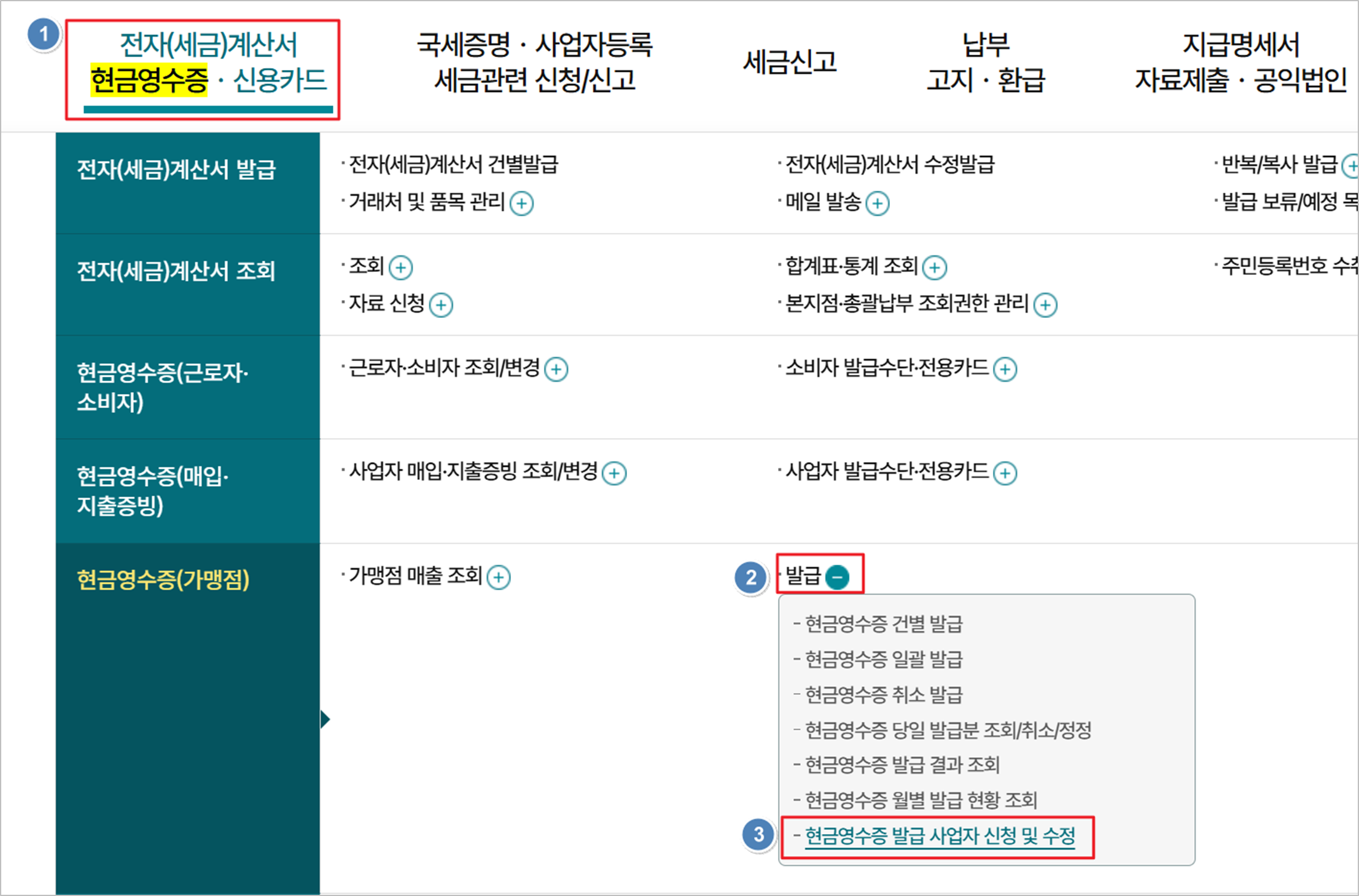 Step 1. 국세청 ARS 전화번호 126에 연결 Step 2. 1️⃣번 홈텍스 상담 선택 Step 3. 1️⃣번 현금영수증 선택 Step 4. 1️⃣번 한국어 선택 Step 5. 4️⃣번 가맹점 현금영수증 발급 서비스 선택 Step 6. 1️⃣번 사업자번호 10자리 입력 Step 7. 1️⃣번 비밀번호 설정 시 본인인증 Step 8. 1️⃣번 비밀번호 4자리 입력