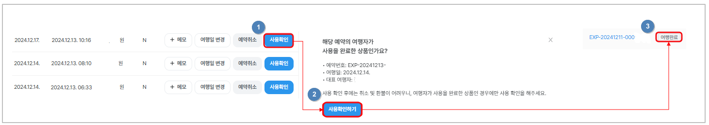 - 투어(상품) 이용 전 사용 완료를 클릭했다면, 예약이 여행 완료 상태로 변경되므로 여행자에게 예약과 관련된 모든 필요 사항을 별도로 안내하셔야 합니다.