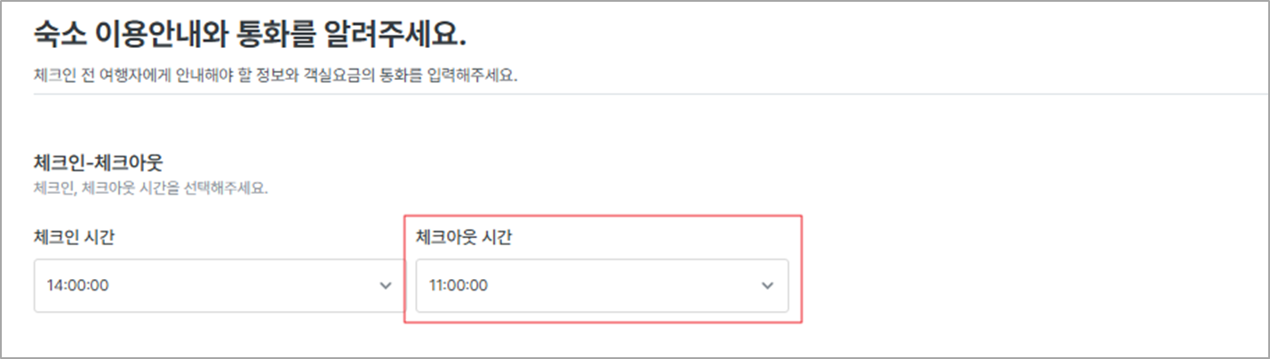 - 파트너 페이지 → 상품 → 한인민박/롱스테이 → 등록된 숙소 선택 → 이용 안내 및 통화 → 체크아웃 시간 설정