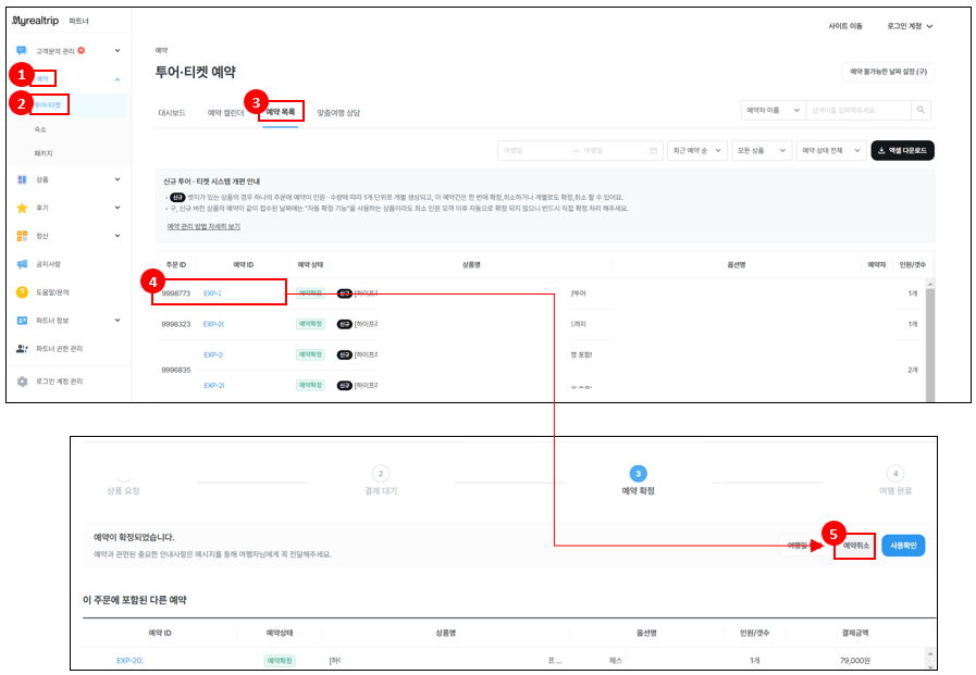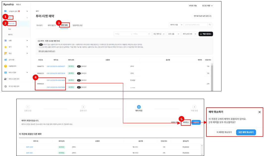 | 🖥️ 파트너 페이지 로그인 → 예약 → 투어/티켓 → 예약 목록 → 예약ID → 예약취소 |