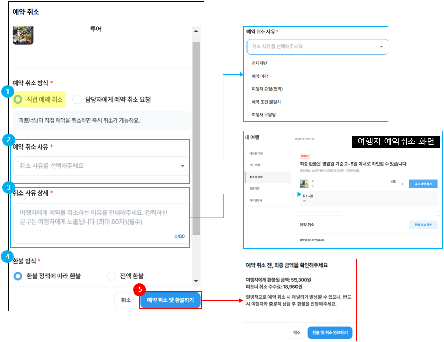 취소 형태(부분 취소, 전체 취소)에 관계없이, 파트너는 [직접 예약 취소] 또는 [담당자에게 예약 취소 요청]을 선택할 수 있습니다.