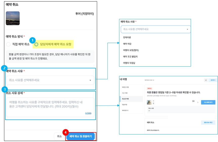 [담당자에게 예약 취소 요청]을 선택한 경우, 마이리얼트립 담당자가 취소 사유를 확인한 후 환불 금액 변경 및 예약 취소 처리 됩니다.