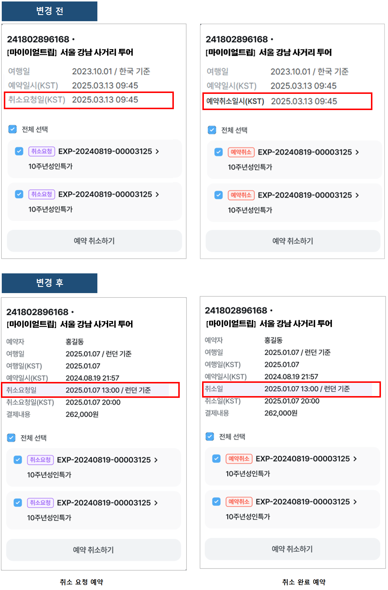 | 취소 완료일 | 한국시간(KST) 기준 예약 취소일 제공 | 상품 대표 도시(현지) 기준 예약 취소일 제공 |