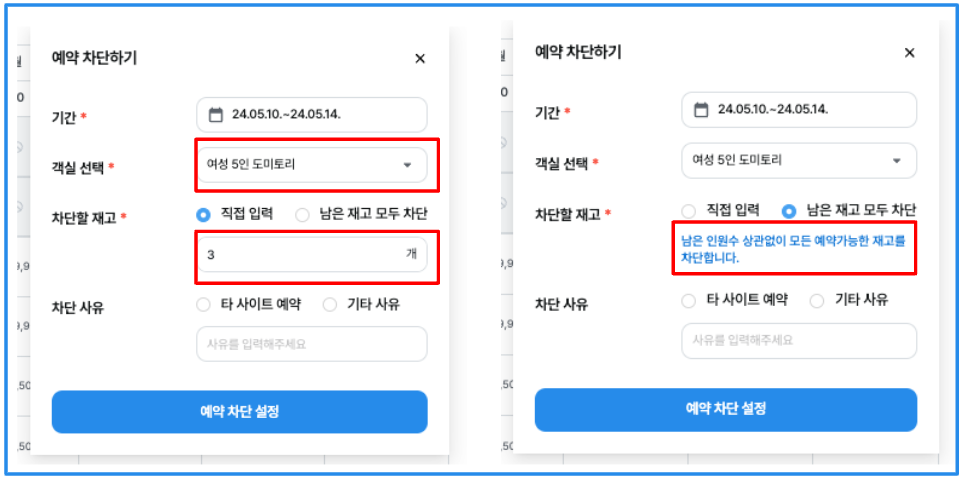 💡 도미토리 객실이 아닌 경우, 별도의 재고 수를 입력없이 차단이 가능합니다.