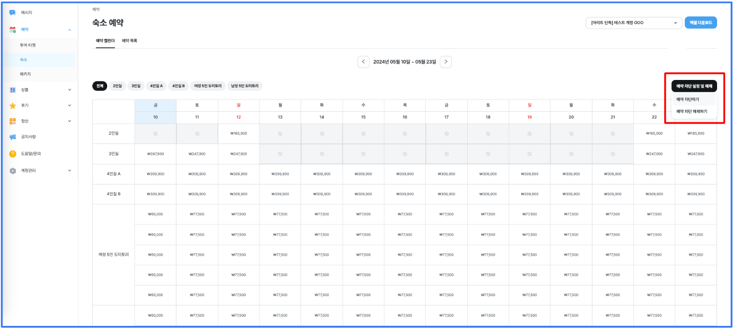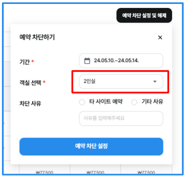 4) 날짜 및 객실 선택 후, [예약 차단 설정] 누르기