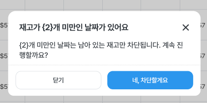 직접 입력 | 남은 재고 모두 차단 |  차단할 수량을 직접 입력합니다. 0은 입력할 수 없으며, 0으로 저장 시 1로 자동 변환됩니다. 재고가 부족한 날짜는 ‘남은 재고까지만’ 차단되며, 재고 수량이 음수(-)로 내려가지는 않습니다. 선택 기간 중 입력값이 잔여재고보다 큰 날짜가 1일이라도 있으면 경고 팝업이 노출됩니다.
