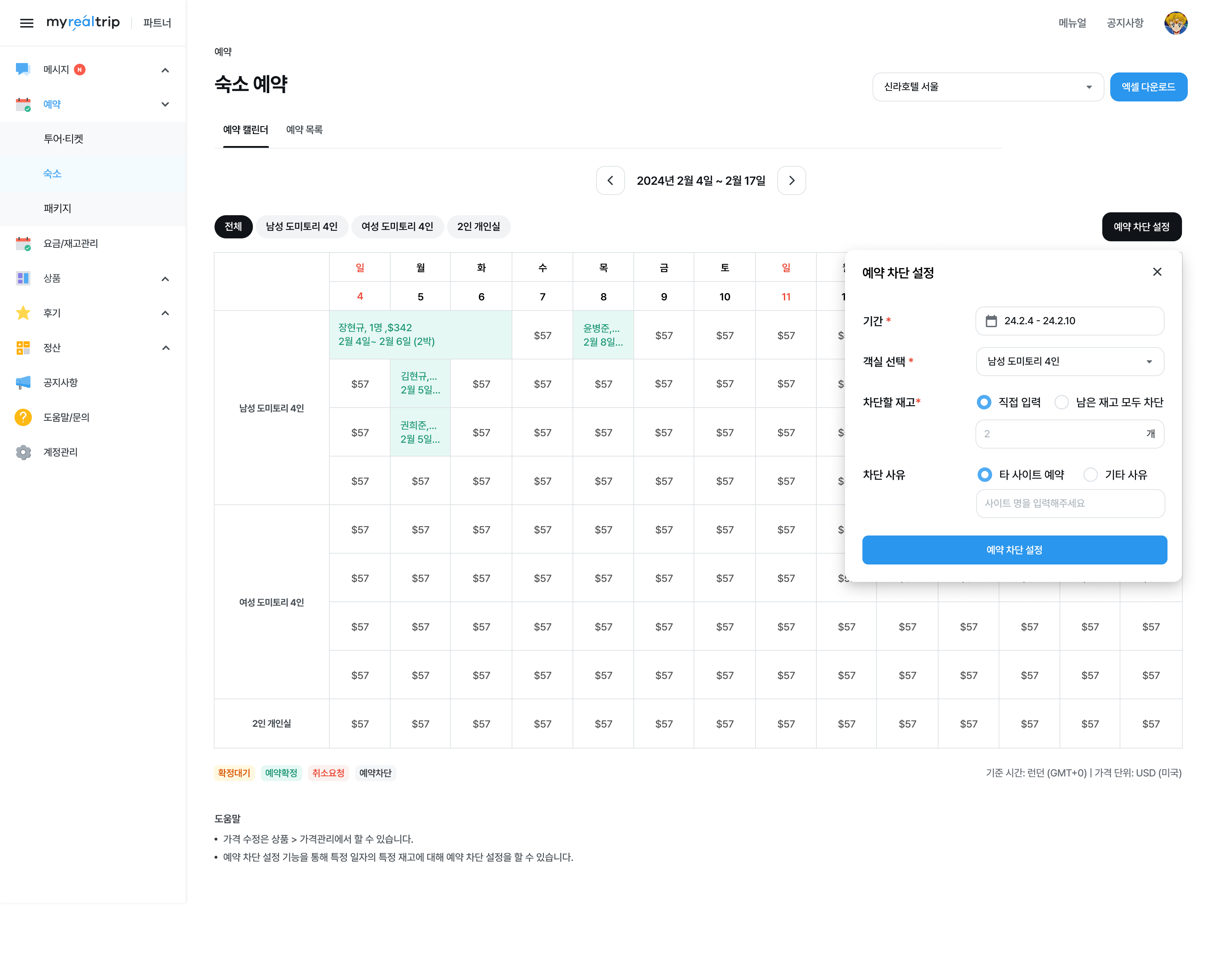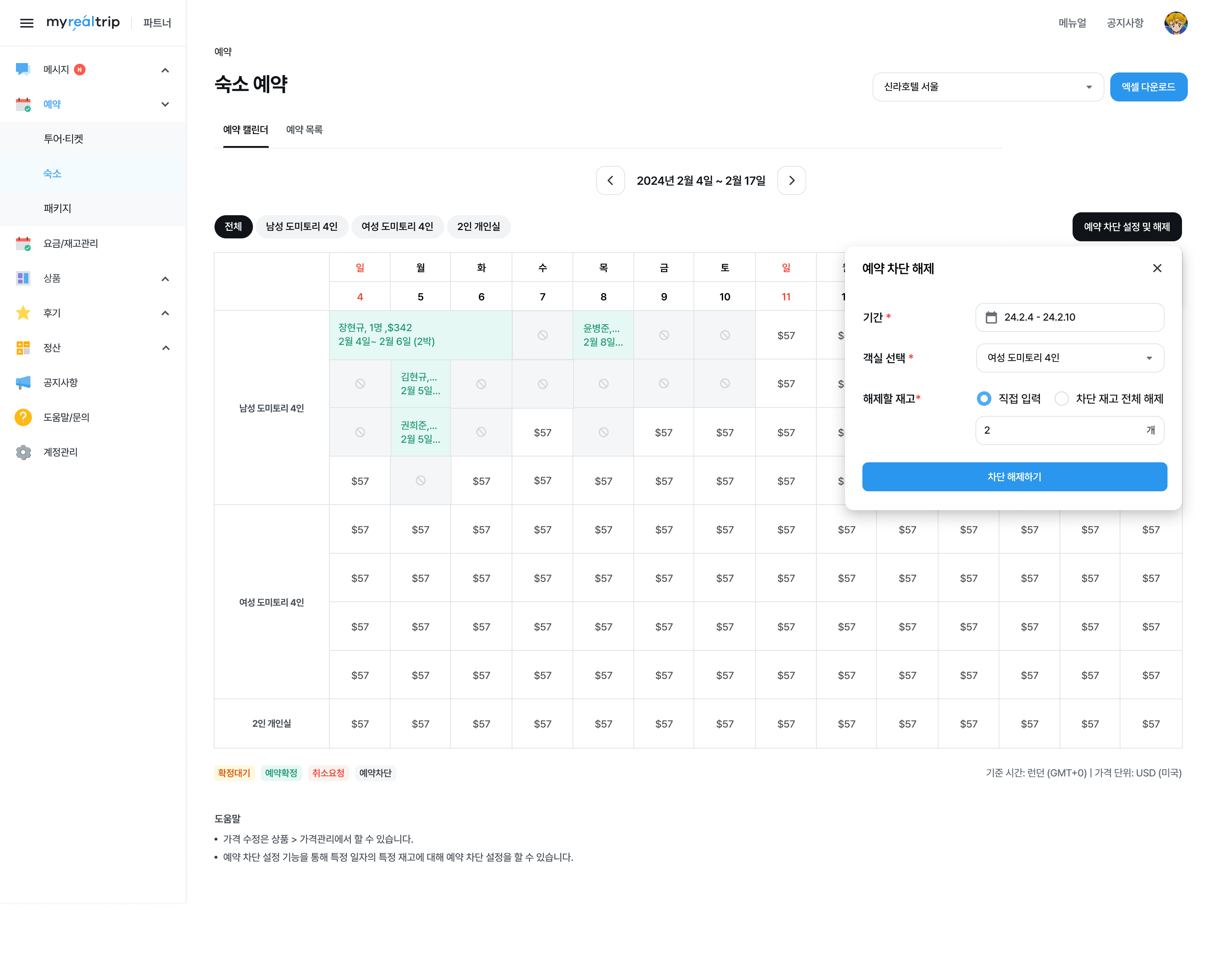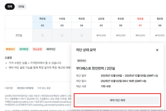 ✅ 기능 적용 상품 - 예약 차단/차단 해제 버튼은 한인민박 / 국내민박 상품에만 노출됩니다.