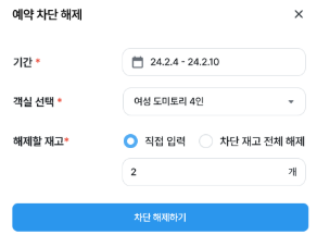 2. 차단 해제 기간 / 객실 / 재고 / 사유 입력하기  | 해제 기간 설정 | - 차단 해제 시작일 ~ 종료일 방식으로 입력합니다.